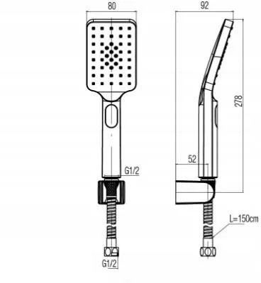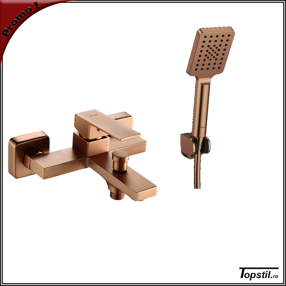 Baterie cada Arce finisaj cupru satinat-mat,la pachet cu para dus trei pozitii de jet,furtun cu protectie otel spiralat,suport de perete ABS.