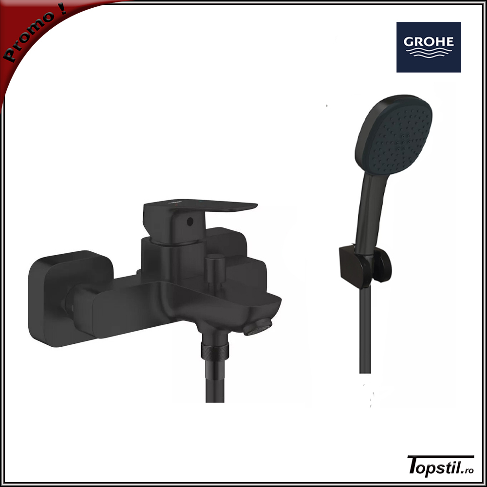 Baterie cada Grohe Cubeo finisaj negru mat cu accesorii – para dus cu doua tipuri de jet – masaj si ploaie,duze anticalcar,comutator pe partea dorsala,furtun PVC 150 cm antitwist,suport de perete cu doua pozitii.