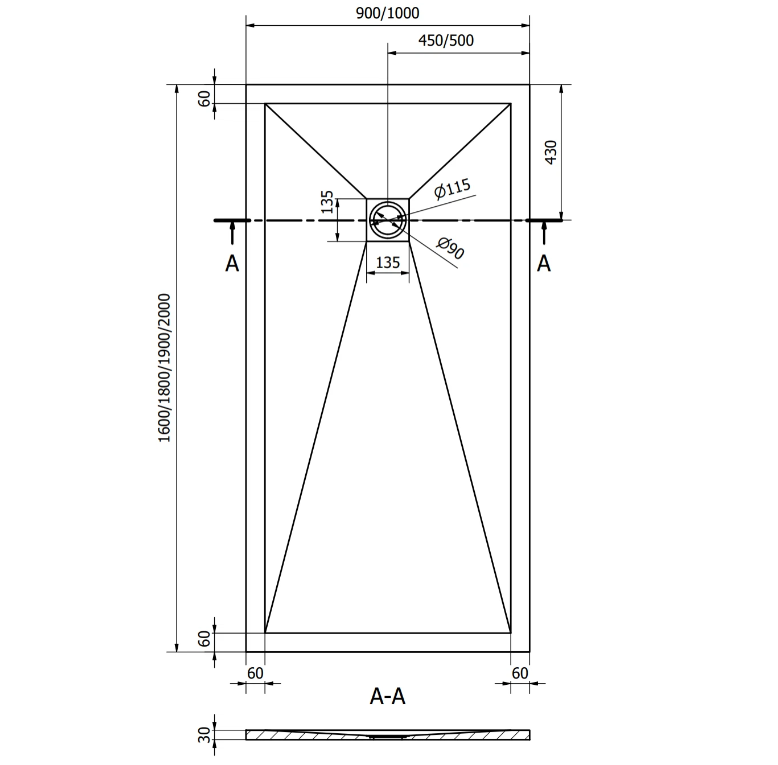 Cadita dus patrata Slim 90×90 cu rigola inox integrata