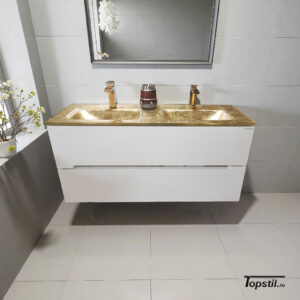 Mobilier baie suspendat dublu Silver 120 cm cu lavoar sticla aurie