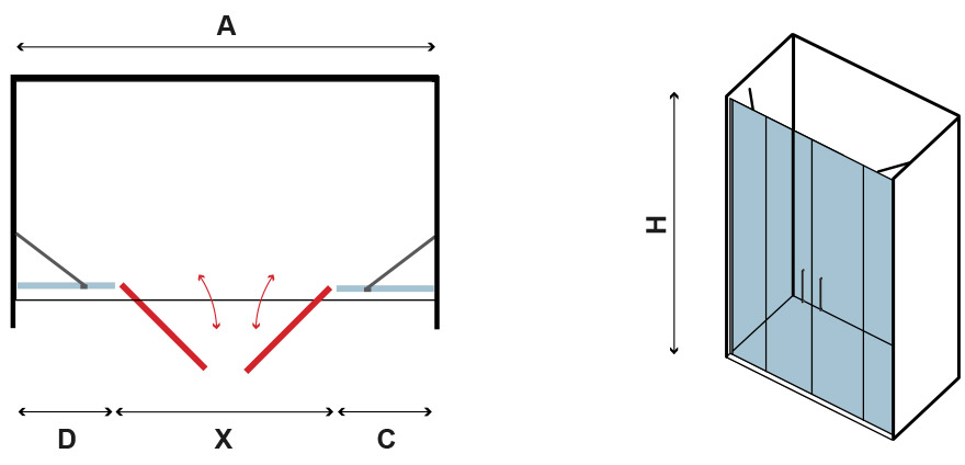 Perete dus din sticla cu doua usi batante – balamale pivotante si doua parti fixe.