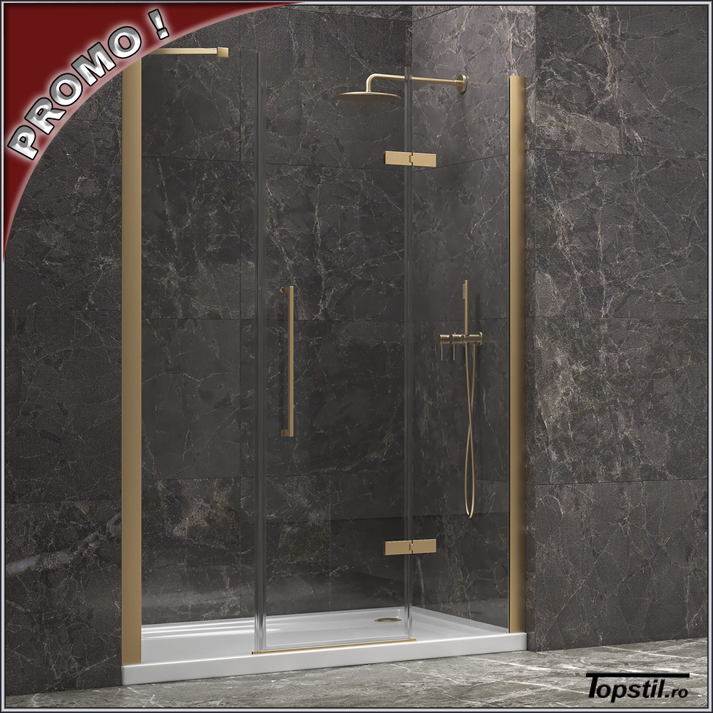 Dimensiuni 180×200 cm – reglaj 179-183 cm, acces cca. 60 cm,sticla de 8 mm grosime tratata anticalcar pe ambele parti, profile aur periat mat.
